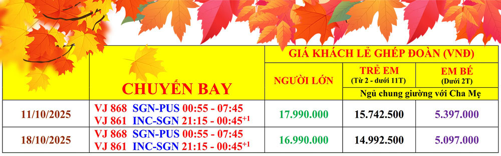 • Vé máy bay khứ hồi theo đoàn của hàng không VIETJET AIR (SGN-PUS-ICN-SGN) 20kg hành lý ký gửi + 10kg xách tay.
