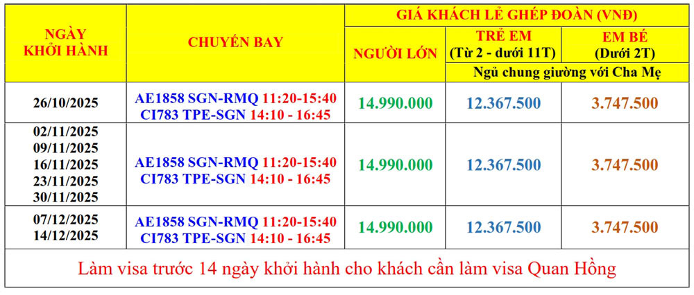 • Do Visa du lịch này là loại đặc biệt nên khi đến Sân bay Đài Loan, Trưởng đoàn sẽ thu hộ chiếu của quý khách và giữ suốt quá trình tour để trình cục du lịch Đài Loan khi cần.