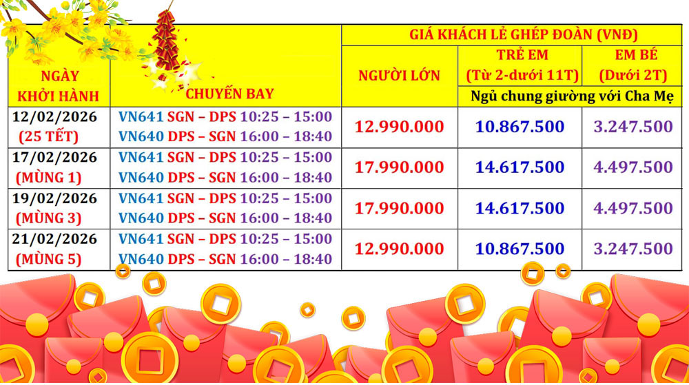 • Phụ phí thuế du lịch Bali: 280.000 vnđ/ khách/tour (nếu có)