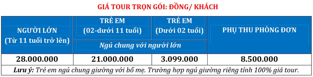 - Trong vòng 20 ngày trước khi tour khởi hành: 100% tổng giá trị tour.