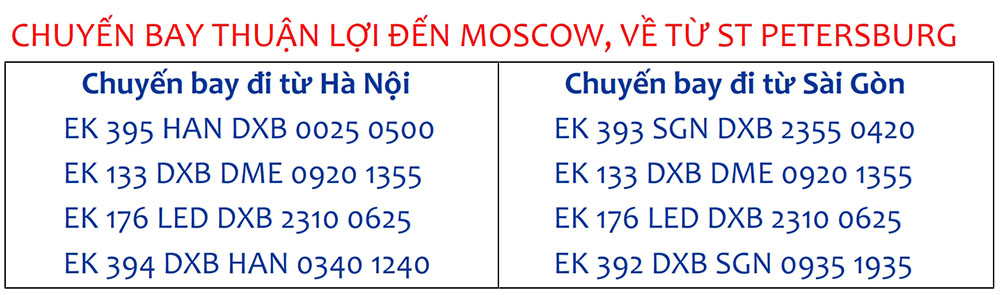 04h20 và 05h00 Đến sân bay quốc tế Dubai, đoàn nối tiếp chuyến bay đi Moscow (khởi hành lúc 9h20). Ăn trưa trên máy bay.