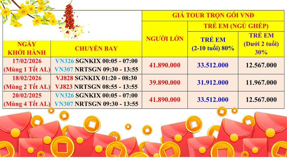 • Trẻ em đủ 10 tuổi trở lên: 100% trọn gói giá tour người lớn.