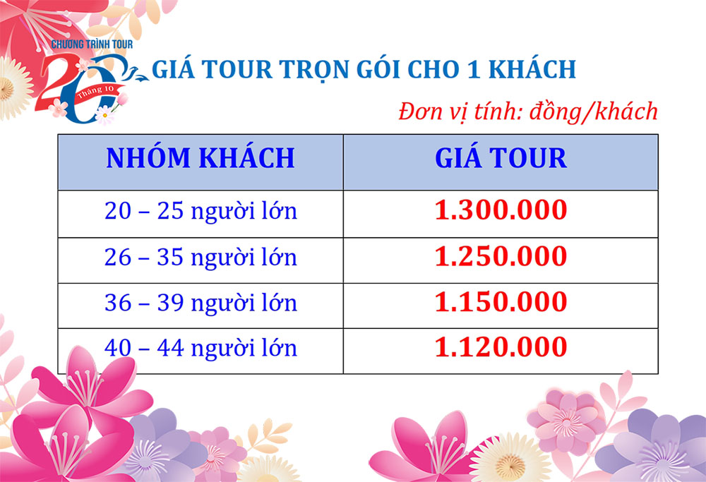 • Trẻ em dưới 5 tuổi: miễn phí (không có ghế ngồi riêng, gia đình tự lo các chi phí phát sinh). 02 người lớn chỉ được đi kèm 1 trẻ em Miễn phí, trẻ em thứ 2 trở trên mua 75% giá tour.