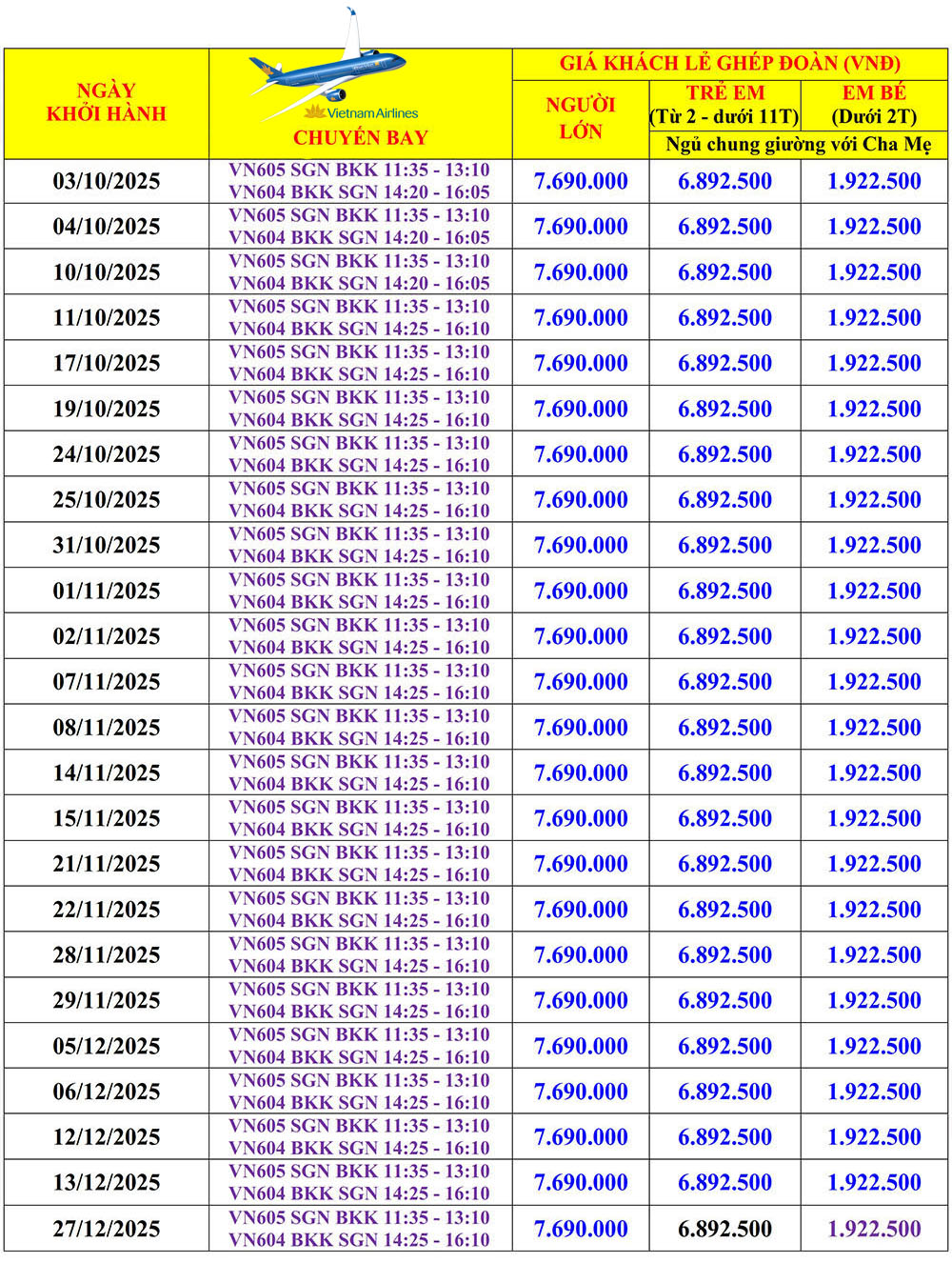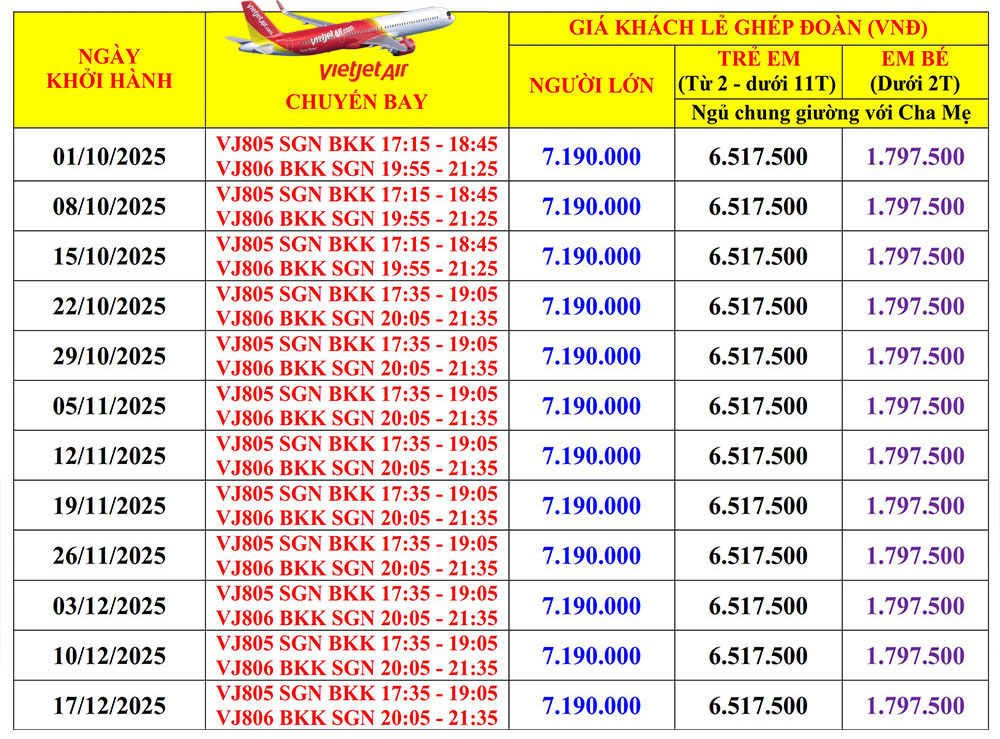 • Vé máy bay khứ hồi theo SGN-BKK-SGN (bao gồm hành lý ký gửi 20 kg và xách tay 7kg).