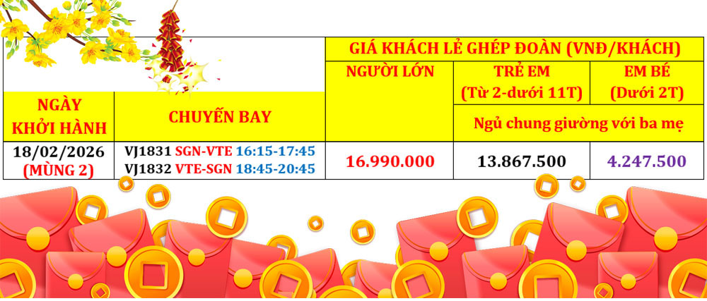 • Vé máy bay khứ hồi SGN - VTE - SGN (20kg hành lý ký gởi + 7kg hành lý xách tay).