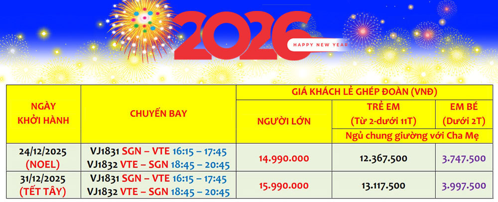 • Vé máy bay khứ hồi SGN - VTE - SGN (Bao gồm 20kg hành lý ký gởi + 07kg xách tay).