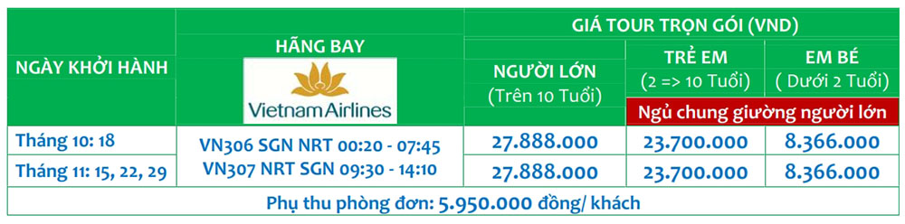 21h30: Quý khách có mặt tại sân bay quốc tế Tân Sơn Nhất, trưởng đoàn làm thủ tục cho đoàn đáp chuyến bay VN306 lúc 00h25 đi Toyko.