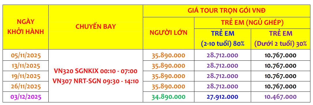 • Trẻ em đủ 10 tuổi trở lên: 100% trọn gói giá tour người lớn.
