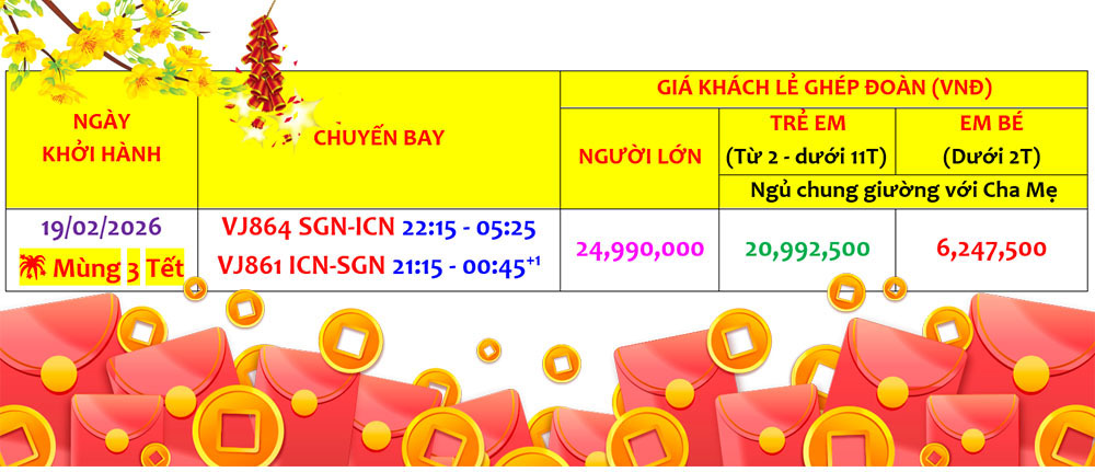 • Vé máy bay khứ hồi theo đoàn, hàng không Vietjet Air (SG-ICN-SGN) 20kg hành lý ký gửi + 7kg xách tay.