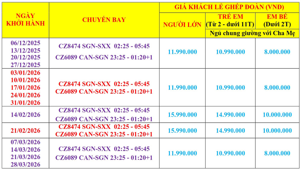 Trưởng đoàn đón Quý khách tại sân bay Tân Sơn Nhất để làm thủ tục check-in đáp chuyến bay CZ8474 SGN-SXX 02:25 – 05:45 đi Thẩm Quyến.