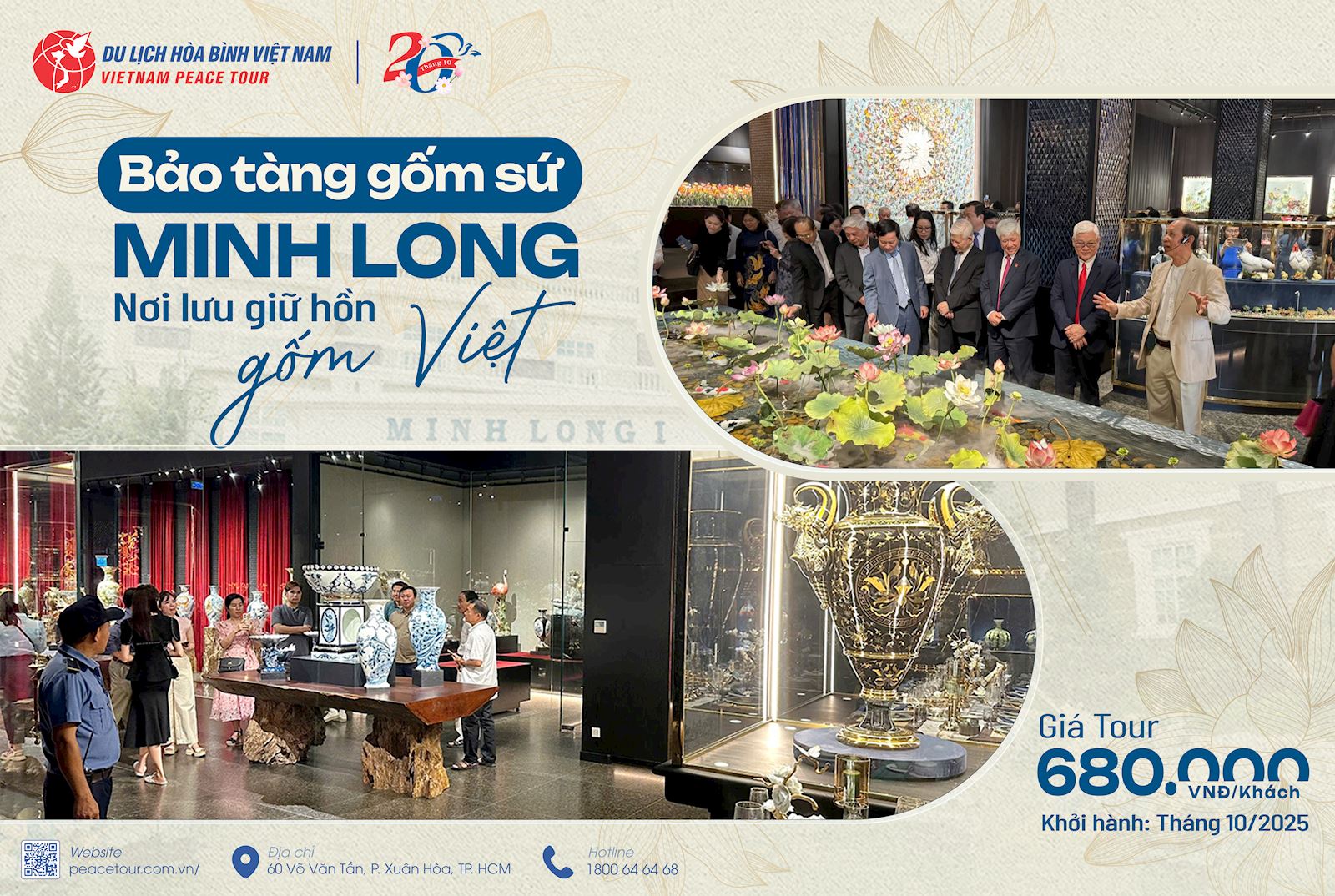 Bạn đang tìm kiếm một hành trình nhẹ nhàng nhưng sâu sắc, giao thoa giữa nghệ thuật – tâm linh – thiền định? Hãy để tour gốm sứ Minh Long - chùa Hội Khánh - tu viện Khánh An của Du lịch Hòa Bình Việt Nam – Peace Tour dẫn lối bạn khám phá những giá trị văn hóa đặc trưng chỉ trong một ngày.